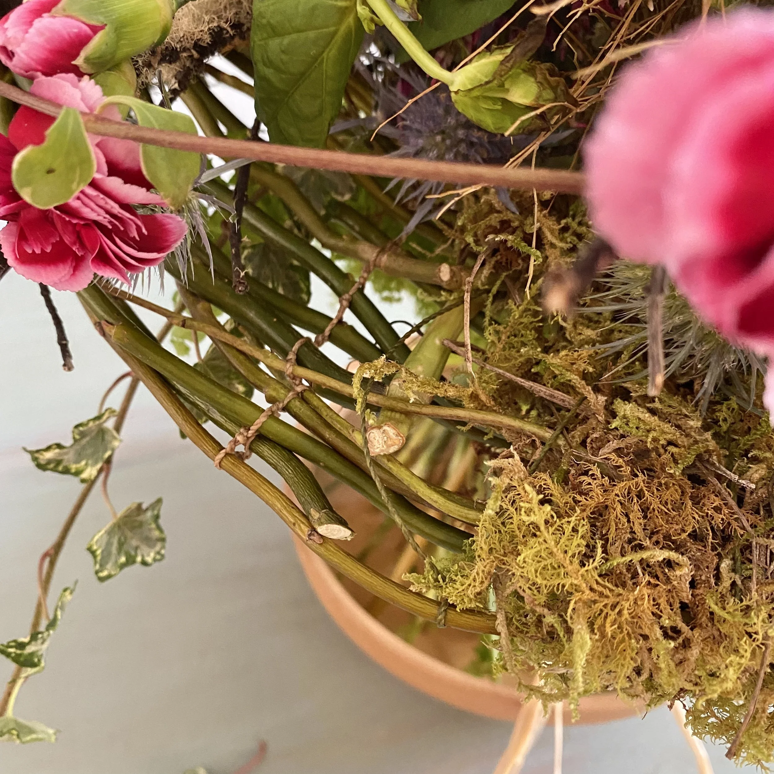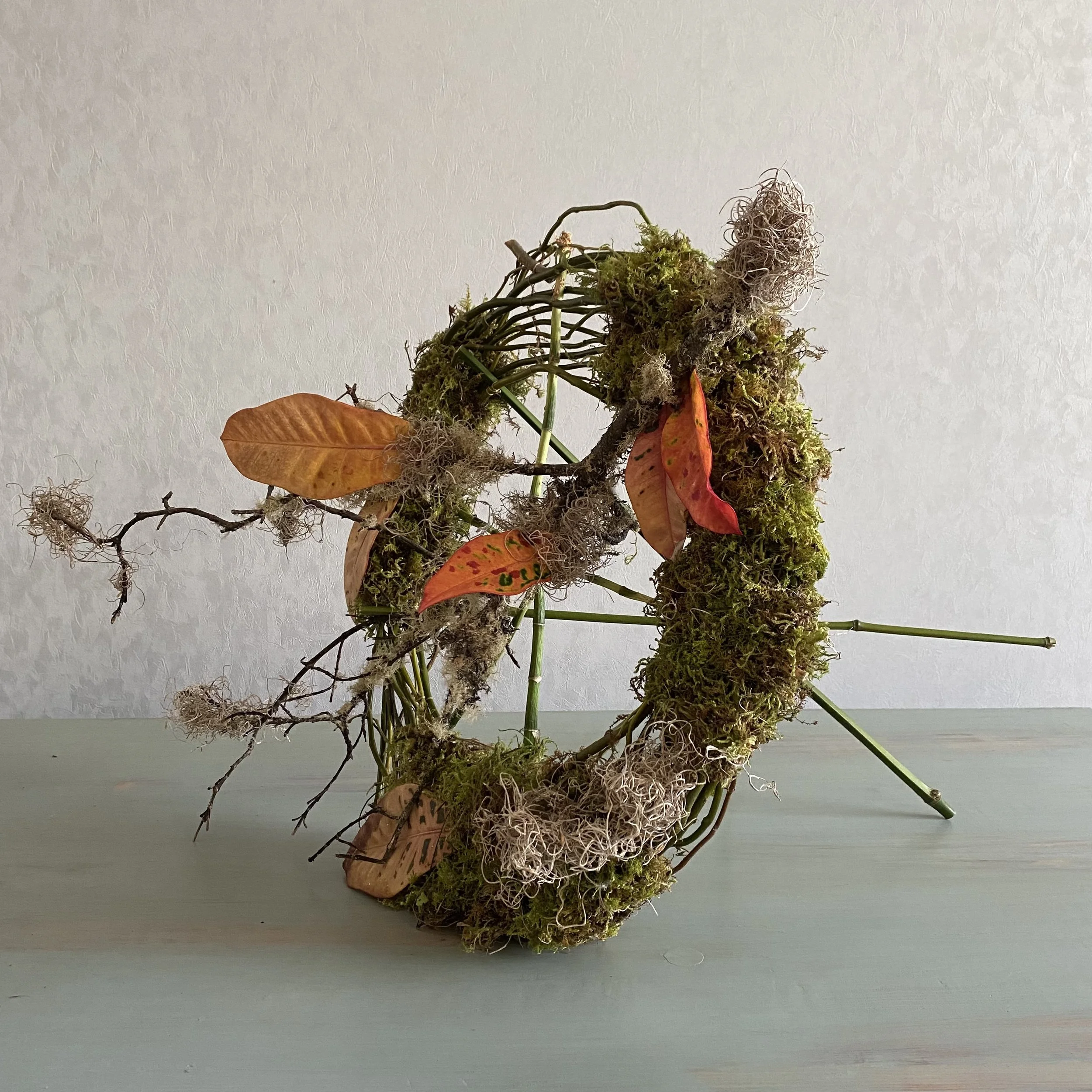 Para la elaboración de la estructura utilicé la técnica de tatami hecha con Curly Willow e hilo de algodón encerado, partes de la superficie de esta estructura está forrada con musgo de manera intercalada y sujetada también con hilo de algodón encerado.
