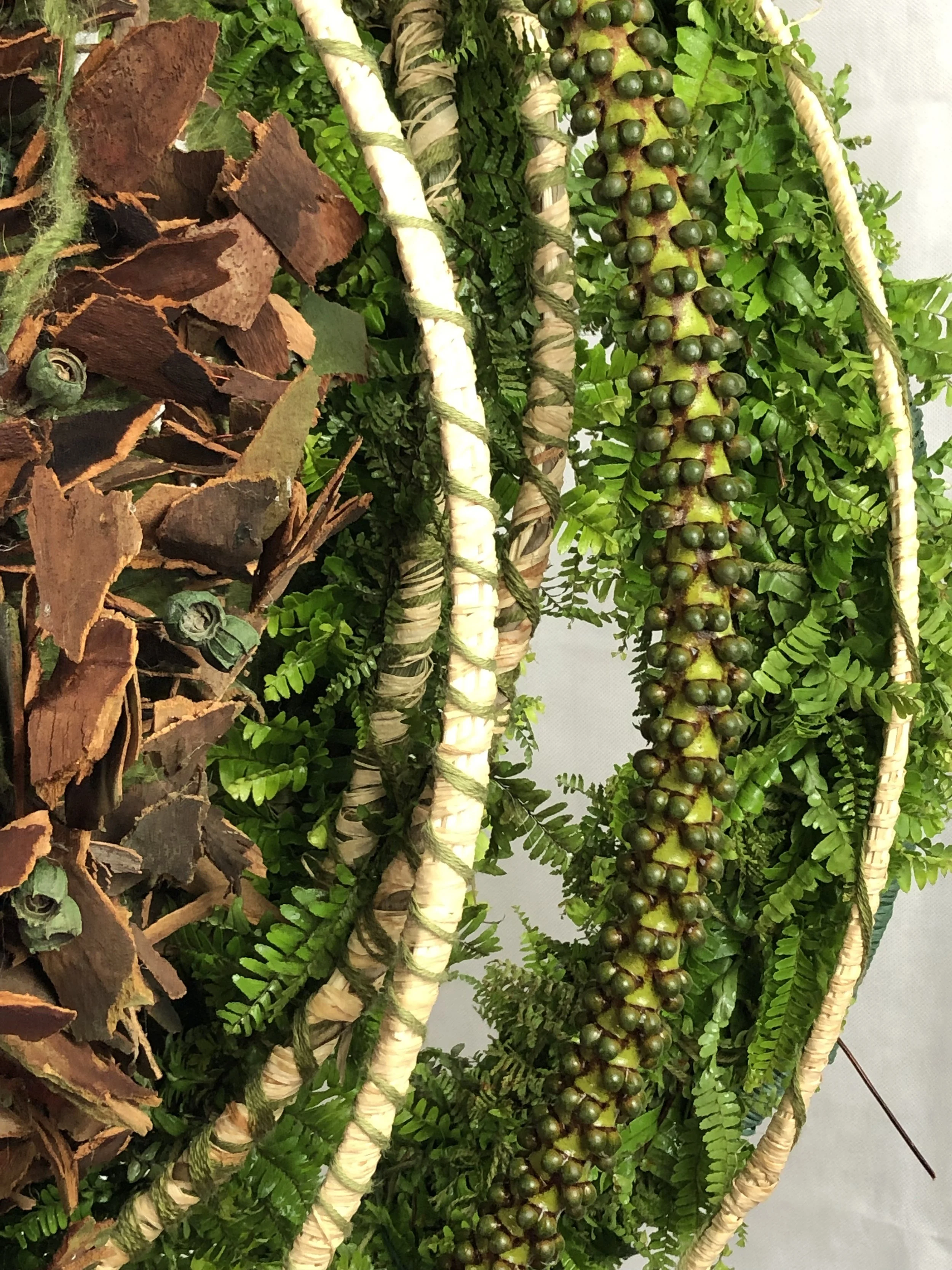THE DESIGN: The design of the coiled round layers represents the journey from this life to the next, to eternal life. The lighter coloured rattan coiled with rafia and cotton represents this life. Also representing this life is the added element of the reused wreath of bark representing the earth. As the coil becomes thicker it becomes green representing the journey to eternal life.